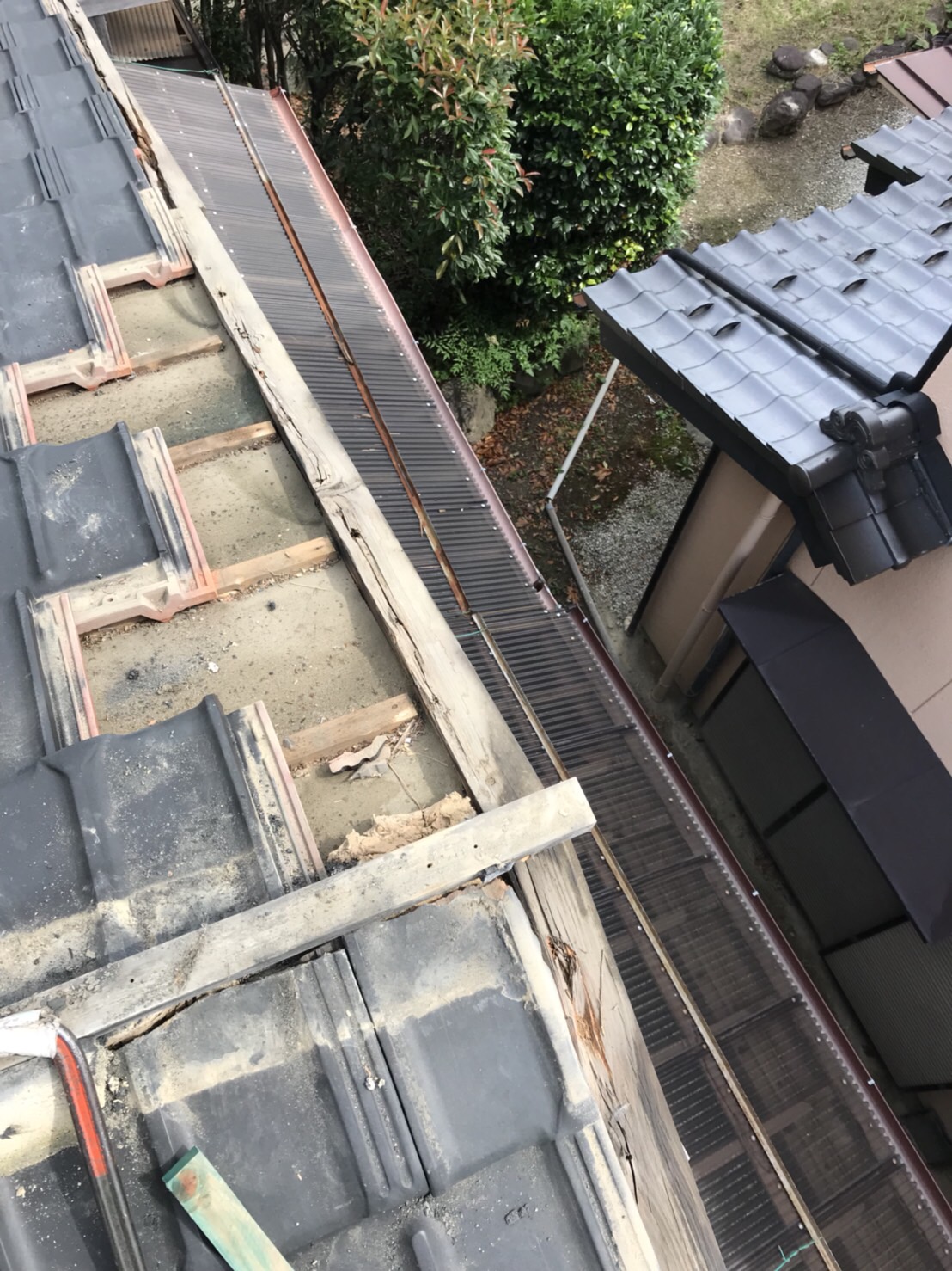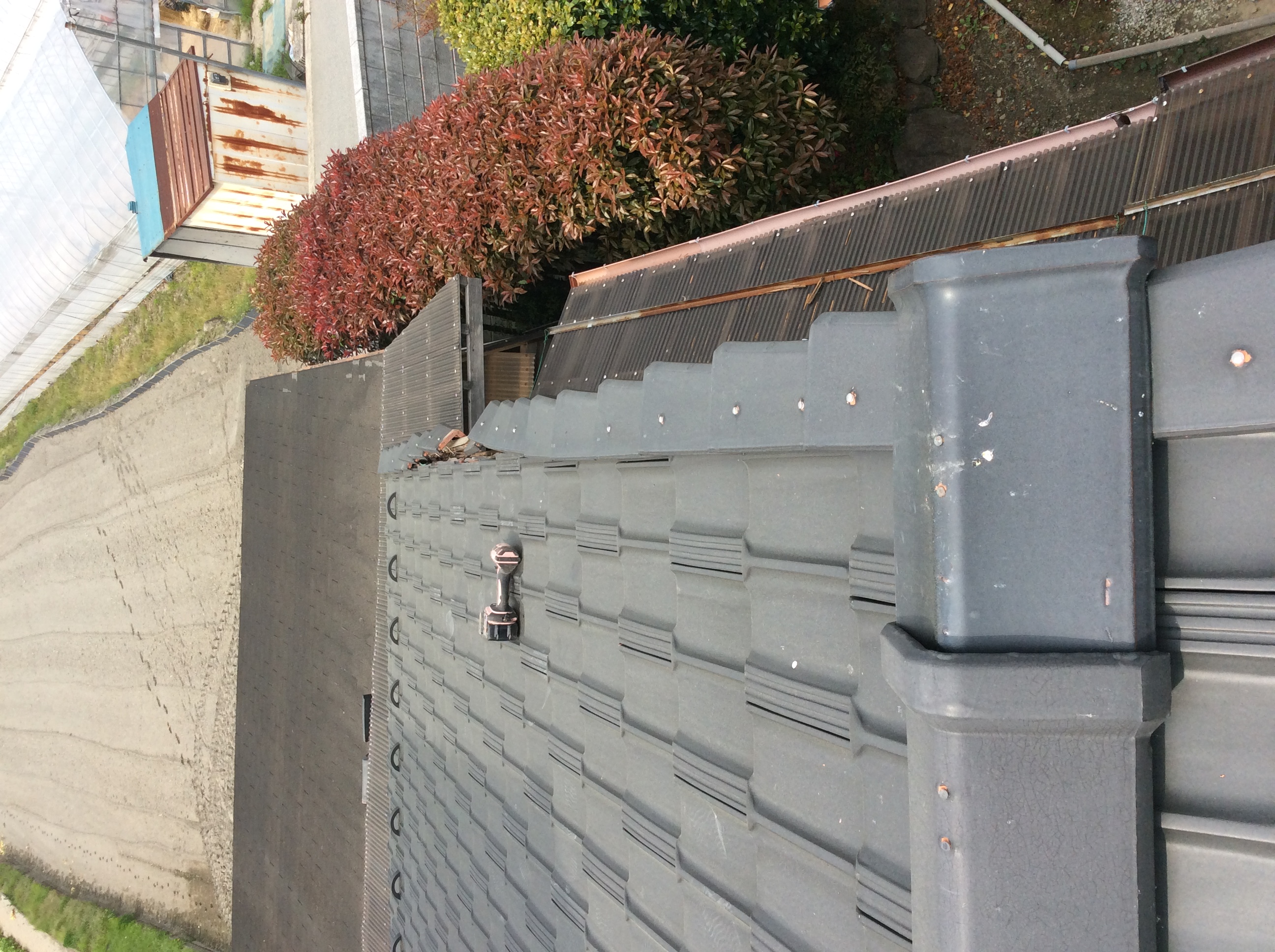 「隣の家に瓦が落ちそうだからすぐ見て‼」という依頼、本当に困っている様子、すぐ駆けつけてみると、このような状態、すでに2枚ほどぶらぶらの物はお客様が外し、安全なところにおいてあるらしい。