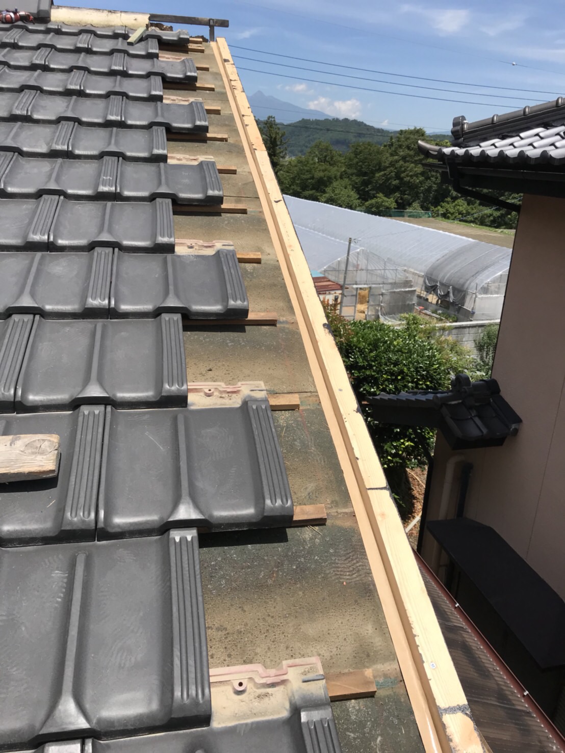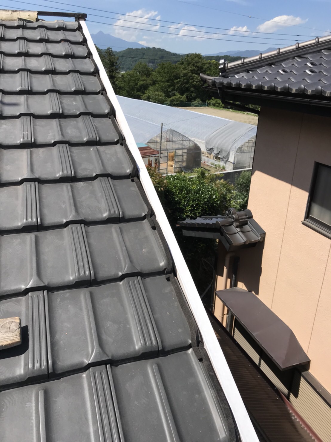 この施工方法が本来の施工方法となるのです、お客様には「本当に暑い中、丁寧な仕事をしていただいてありがとうございます」と言う言葉頂き本当にうれしかったです、この日は気温35度で屋根の上は50度近くなります、言葉一つで救われます、こちらこそありがとうございました、これで完璧‼