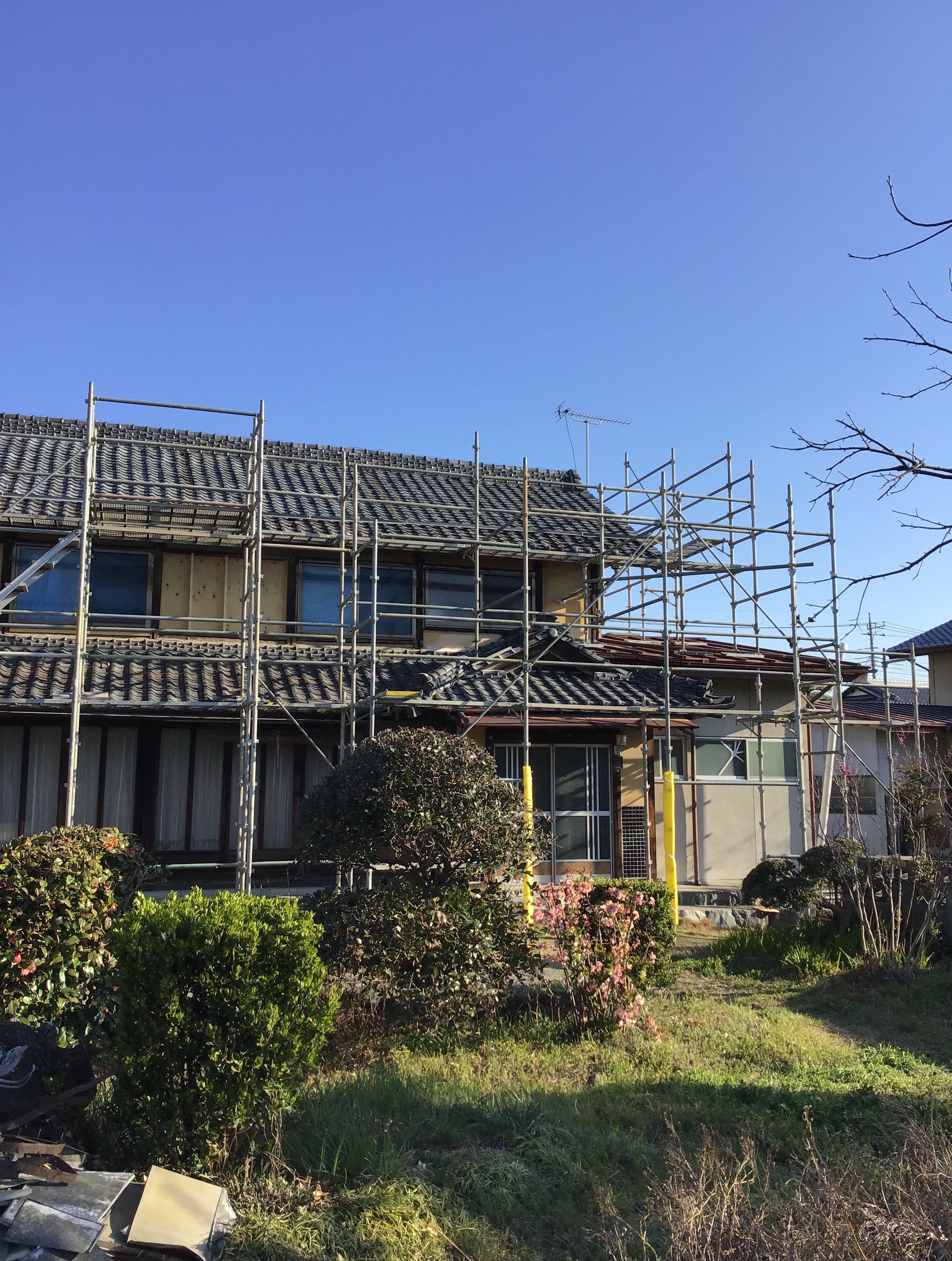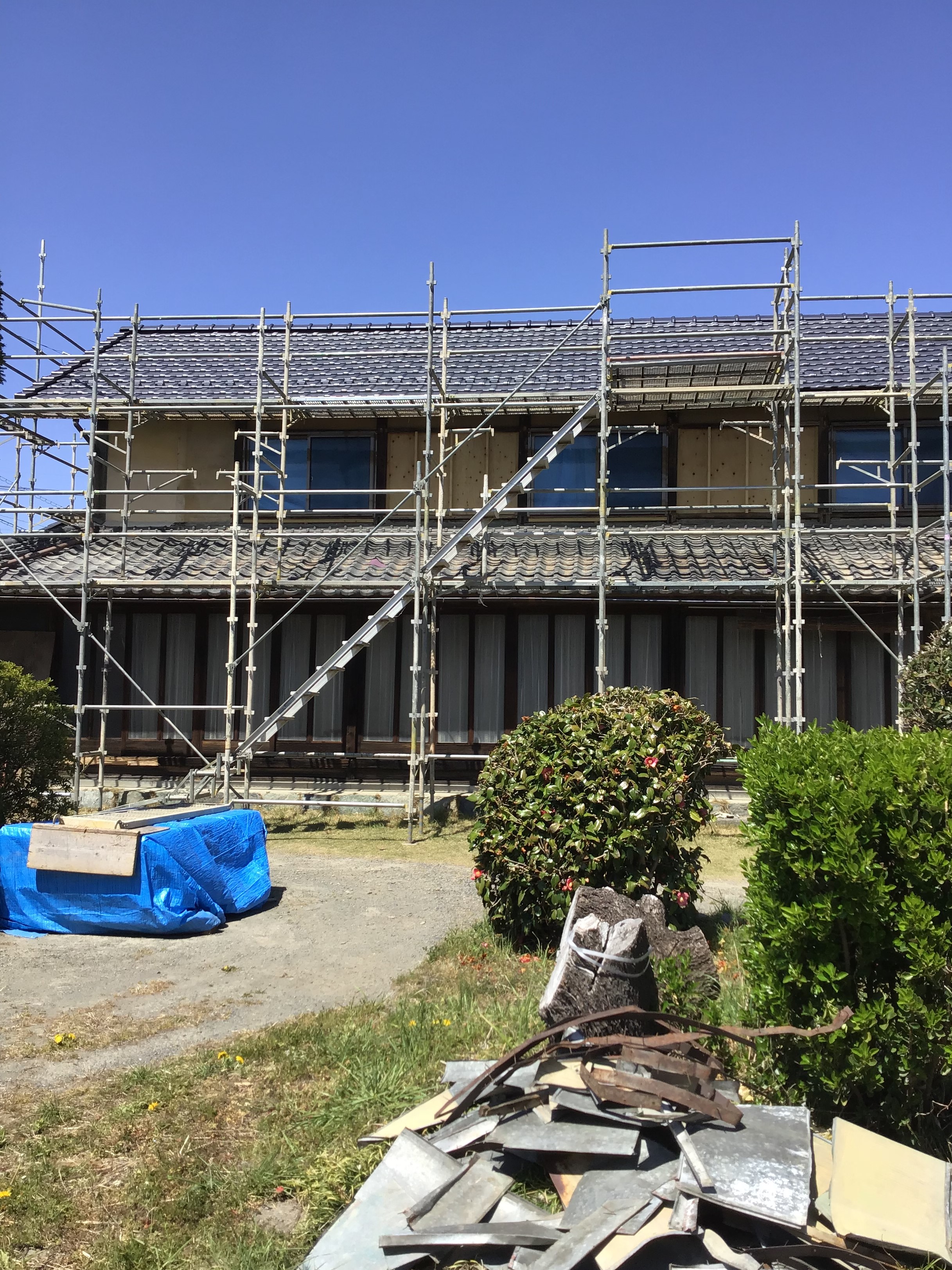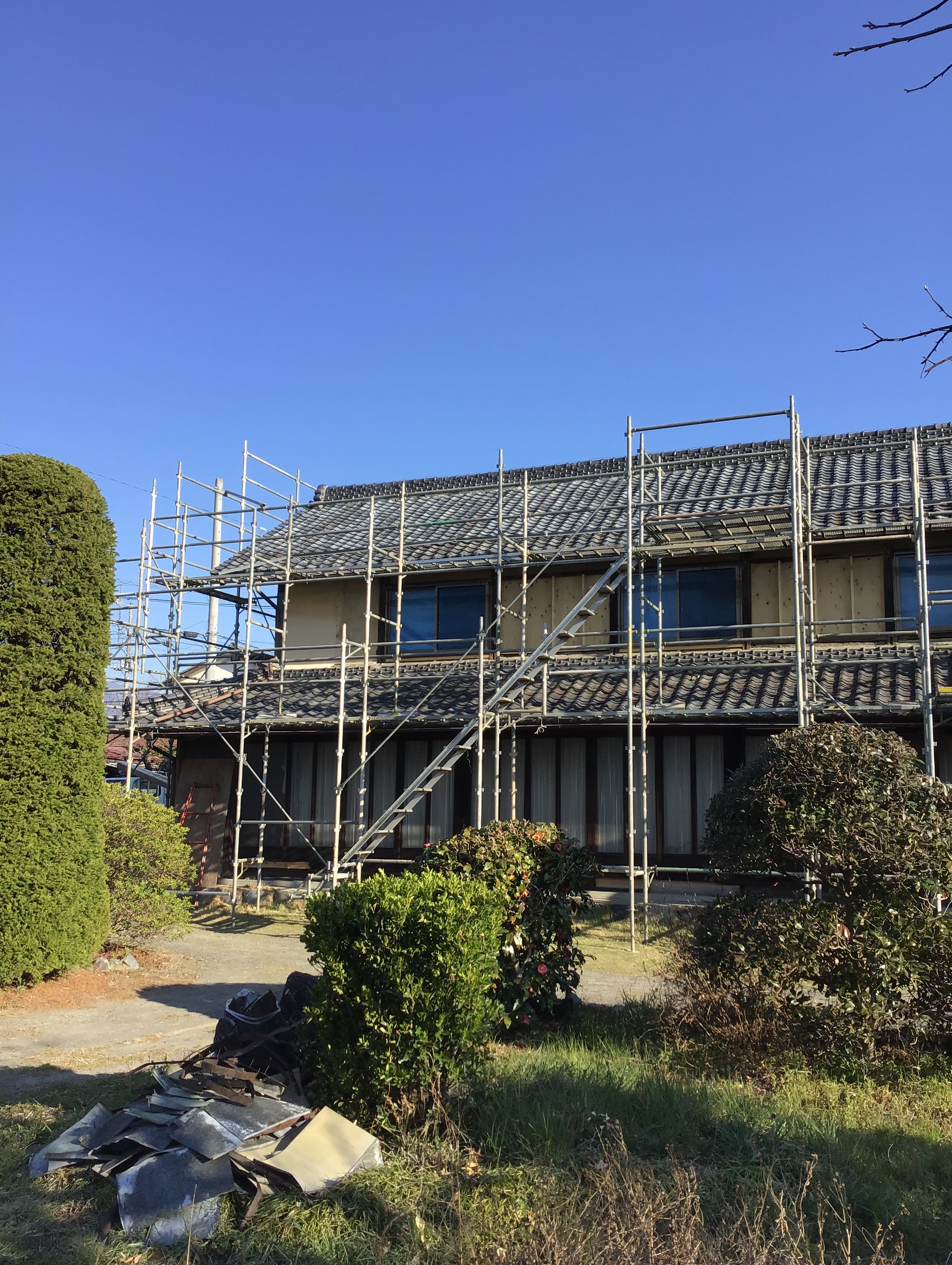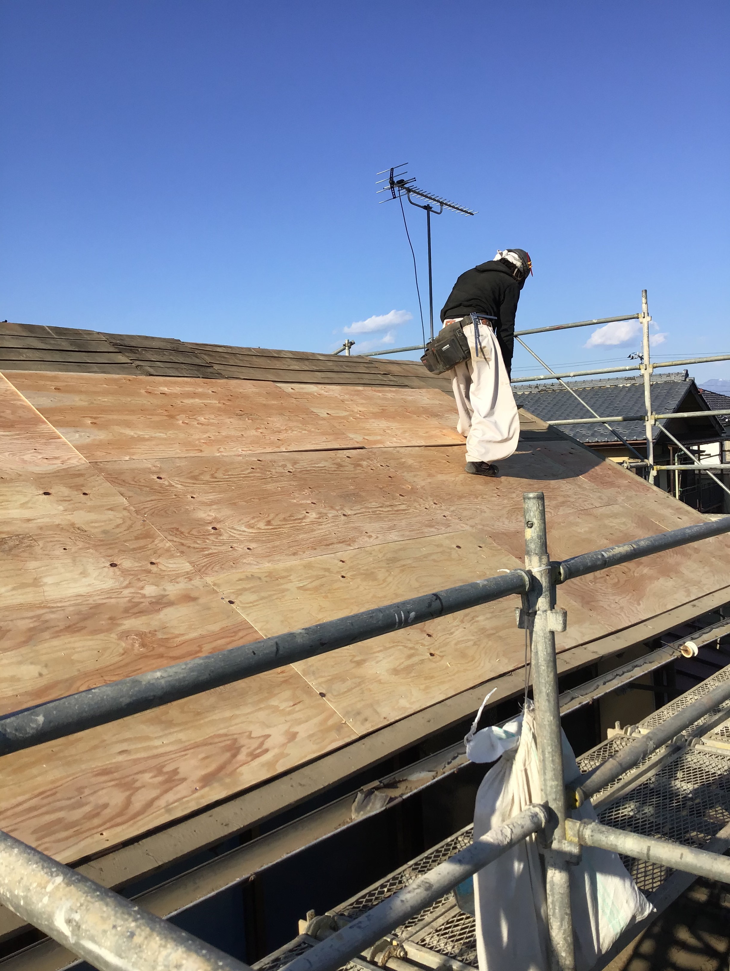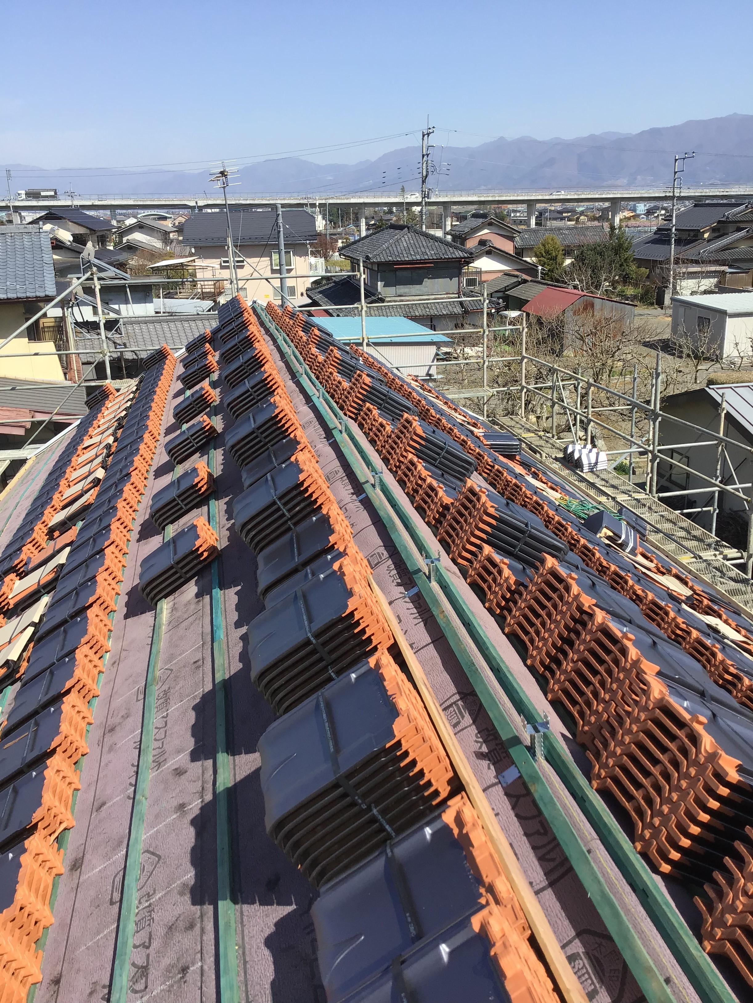 大屋根の瓦工事完了です、下屋根の足場を外してから、下屋根工事に入ります。
