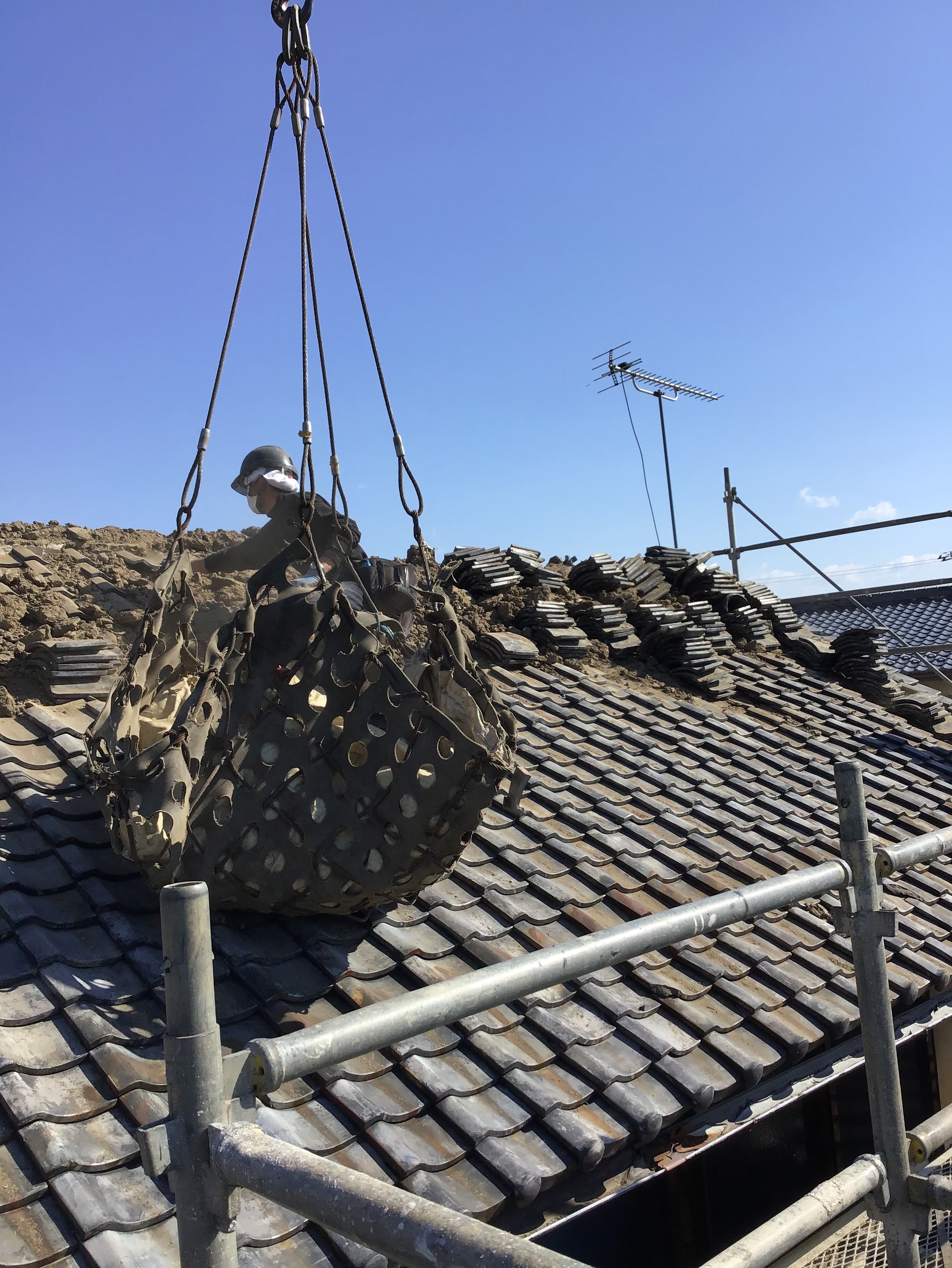 クレーンとハンガーフォークを使って瓦を上げます。