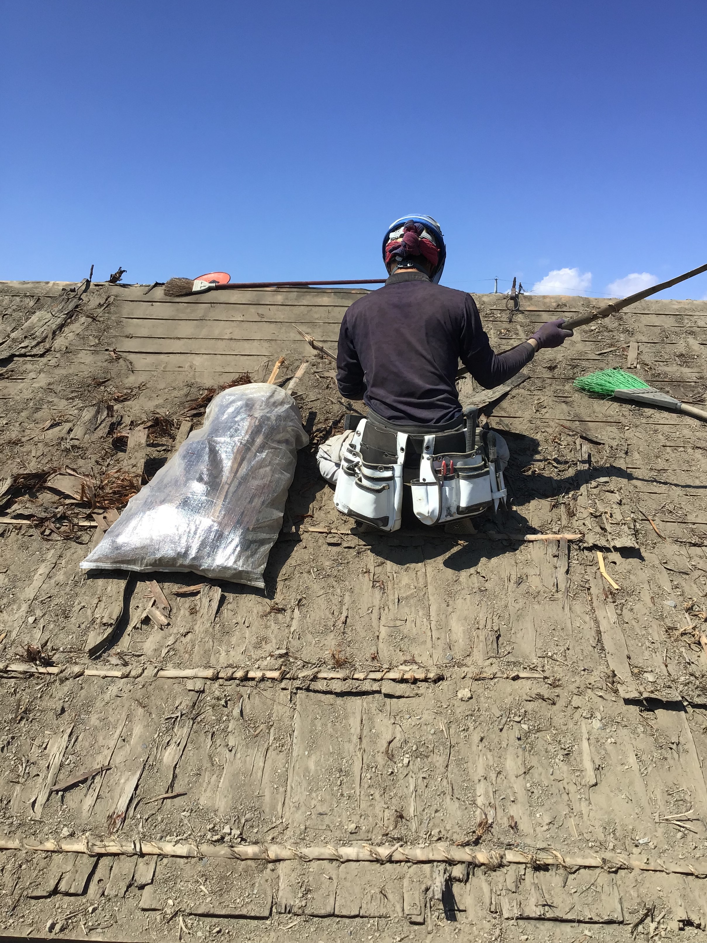 杉の皮を剥がすと、当時の野地板が顔を出します、杉皮や土のおかげで板自体はほとんど傷んでいません。