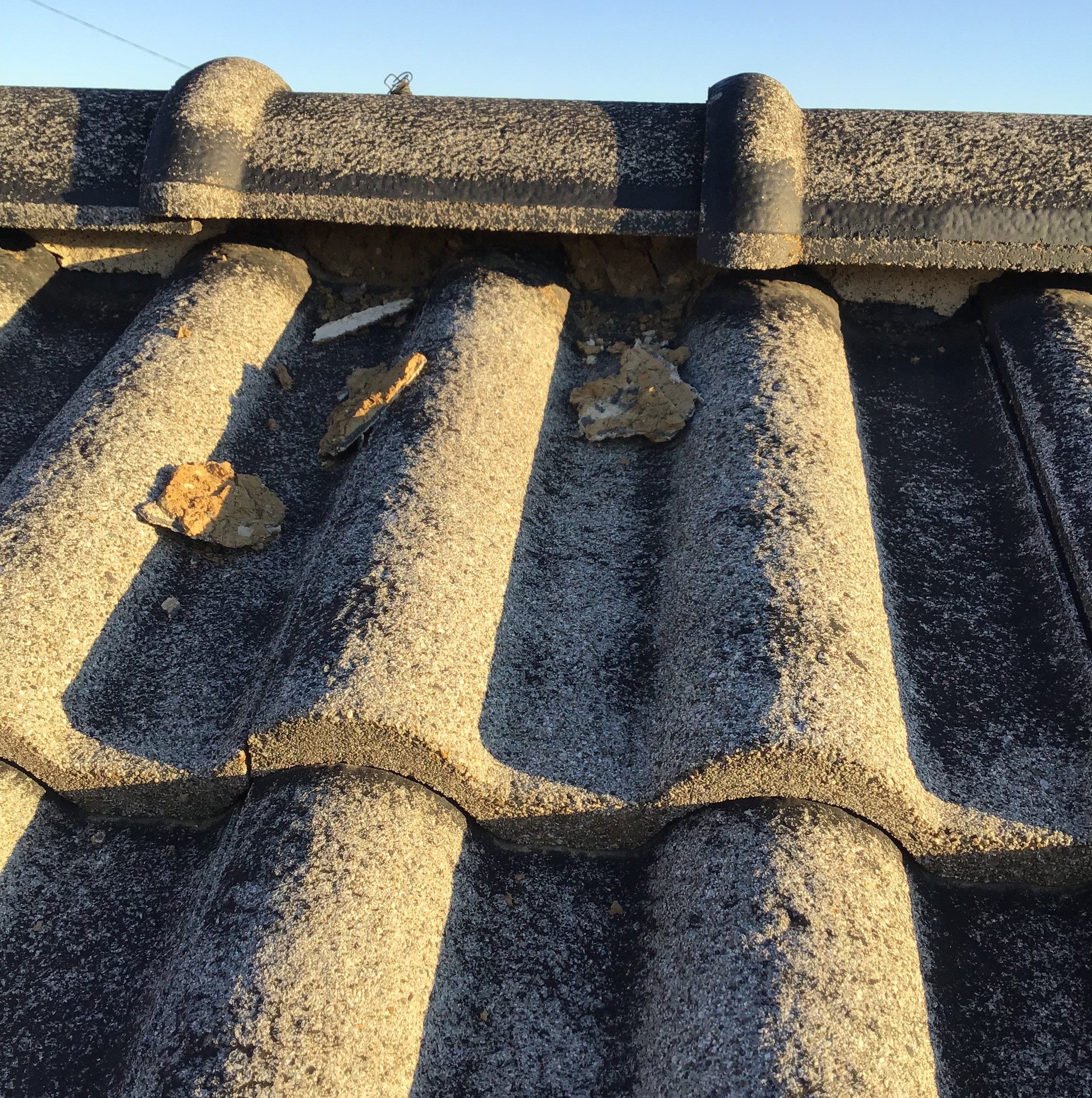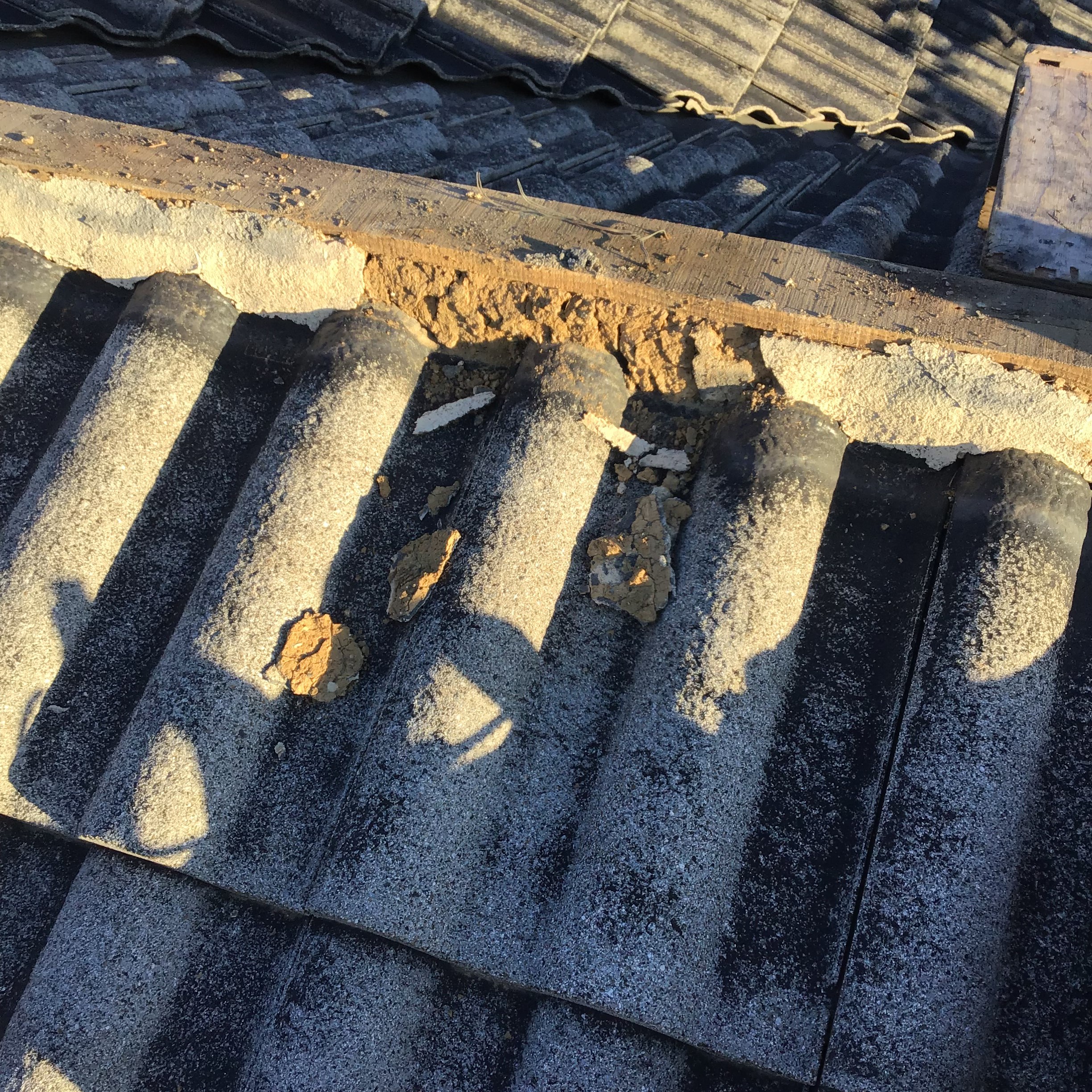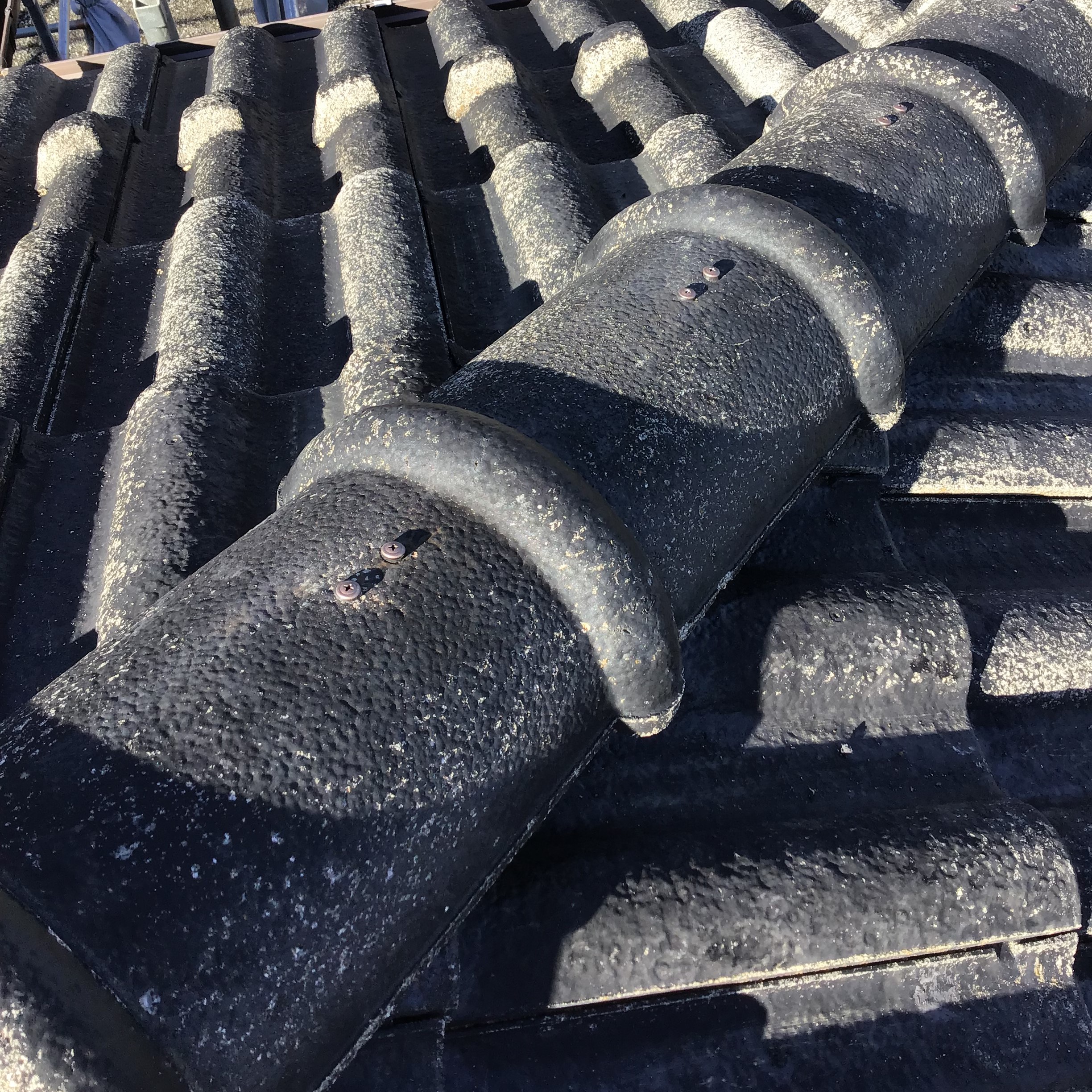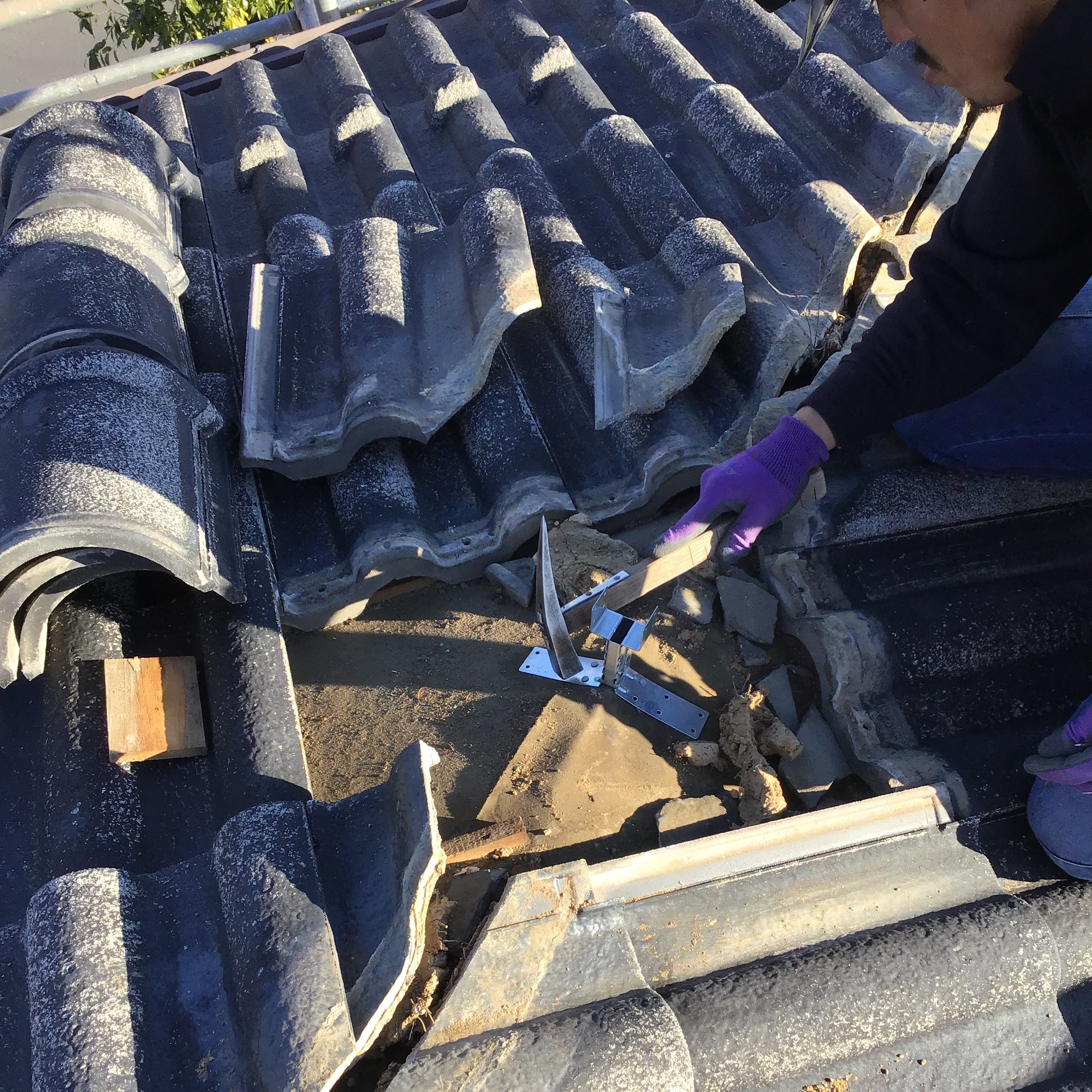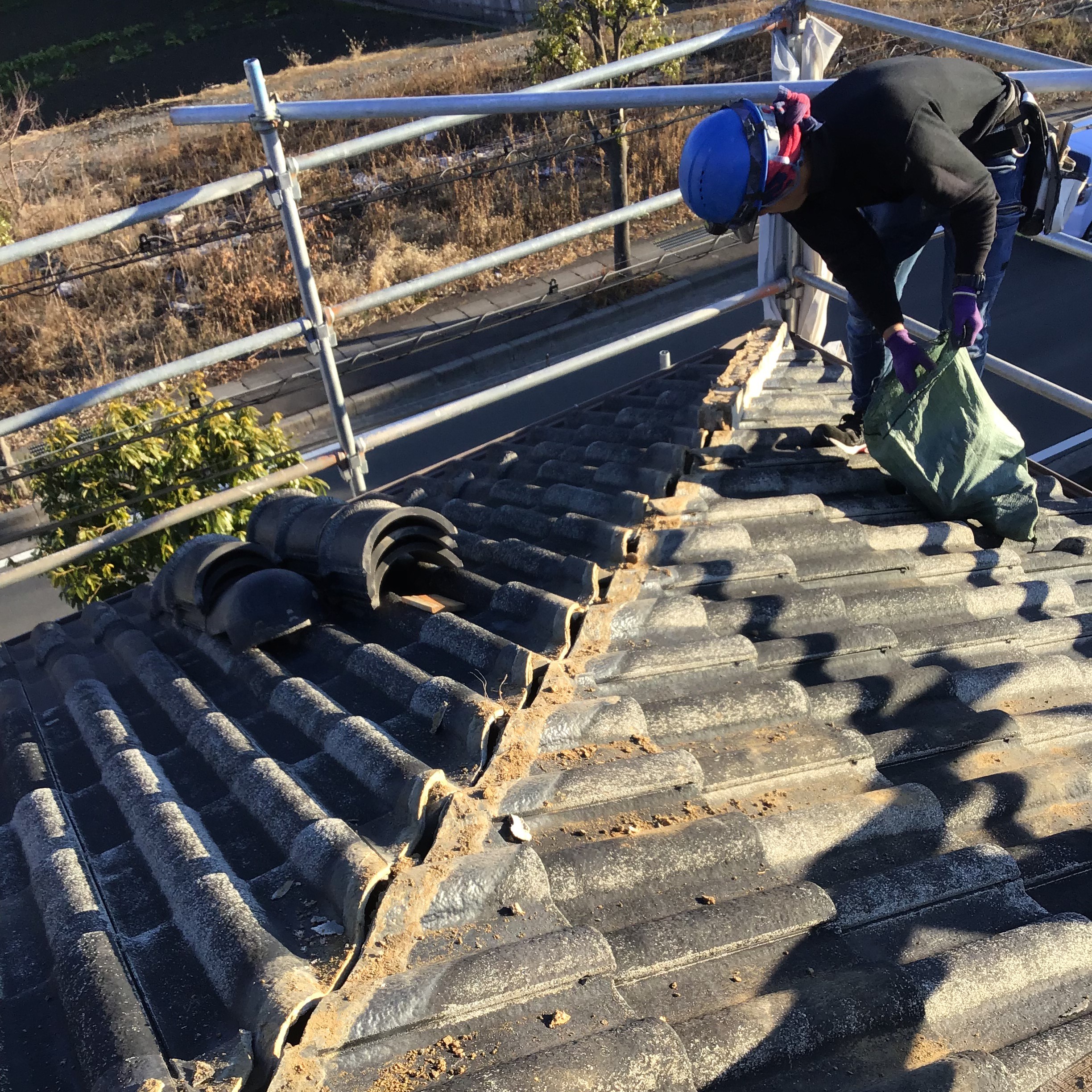 知り合いの塗装屋さんより依頼があり「屋根の塗装をするのだけど、棟がわらを見たら漆喰が落ちていたり、瓦がズレていたりしているので、見てください」との依頼を受けて、現調したところ、シックイはところどころ落ちていたり、瓦がズレて雨が入っている状態でした、「これはもう棟の取り直しをしなければなりませんよ」というお話をさせていただきました、では塗装をする前にということで急ではありますが依頼を受け工事という流れになりました。