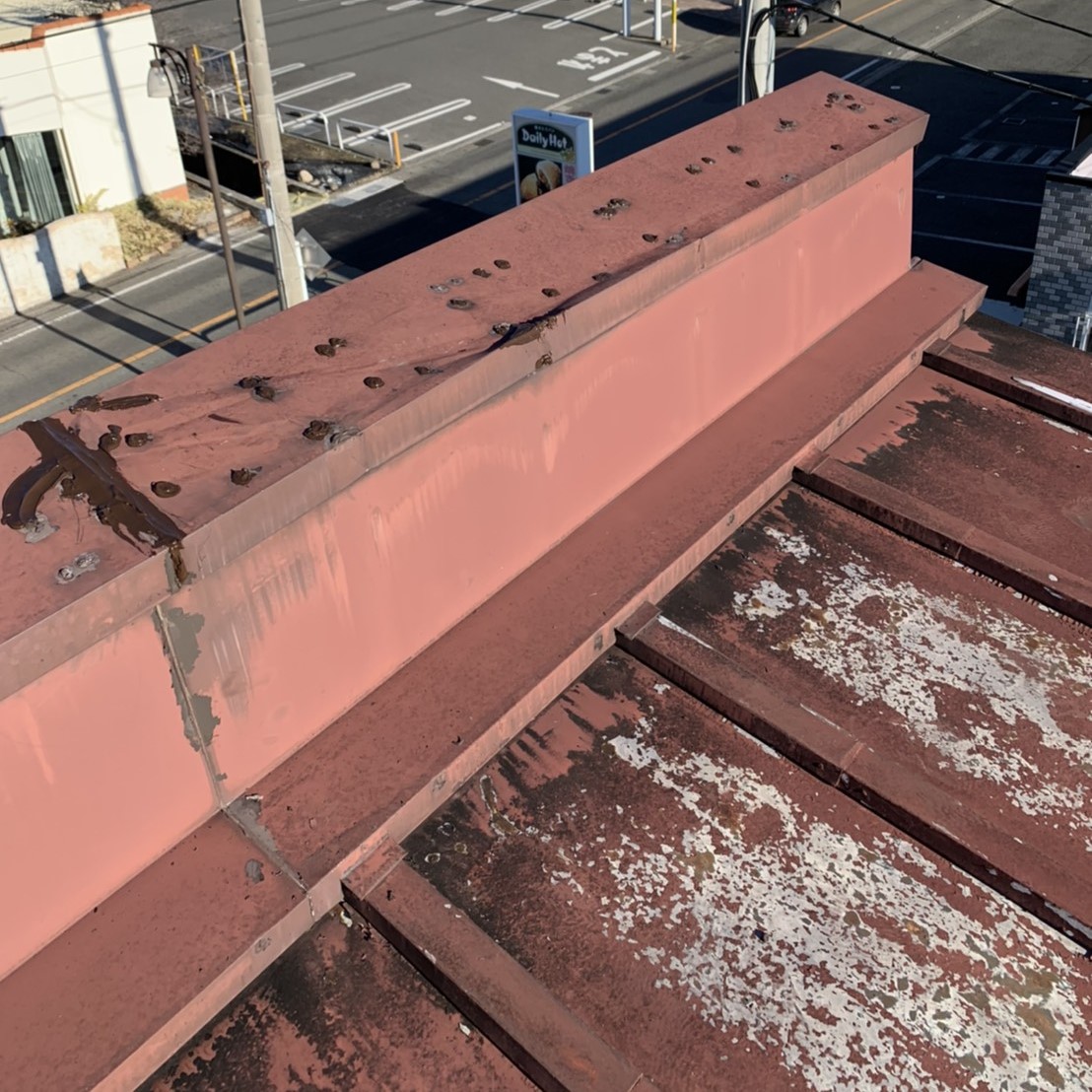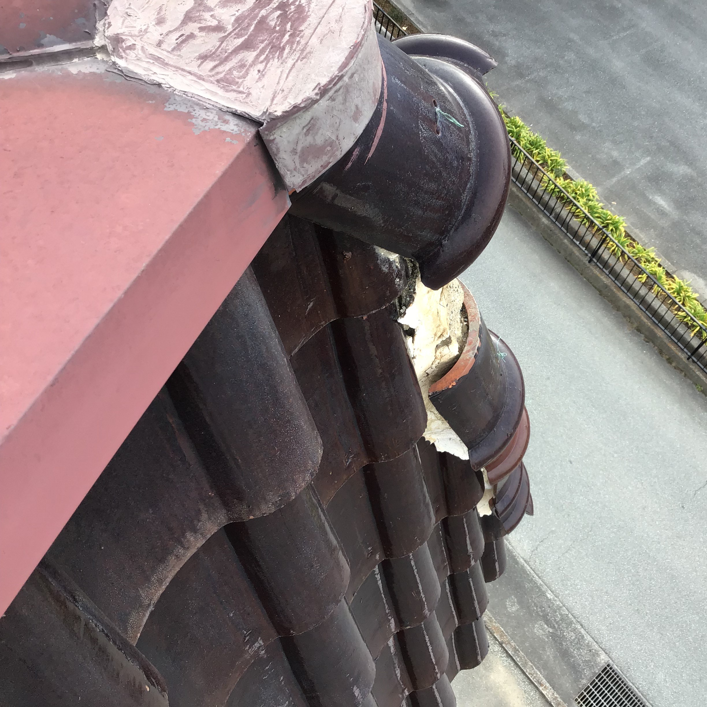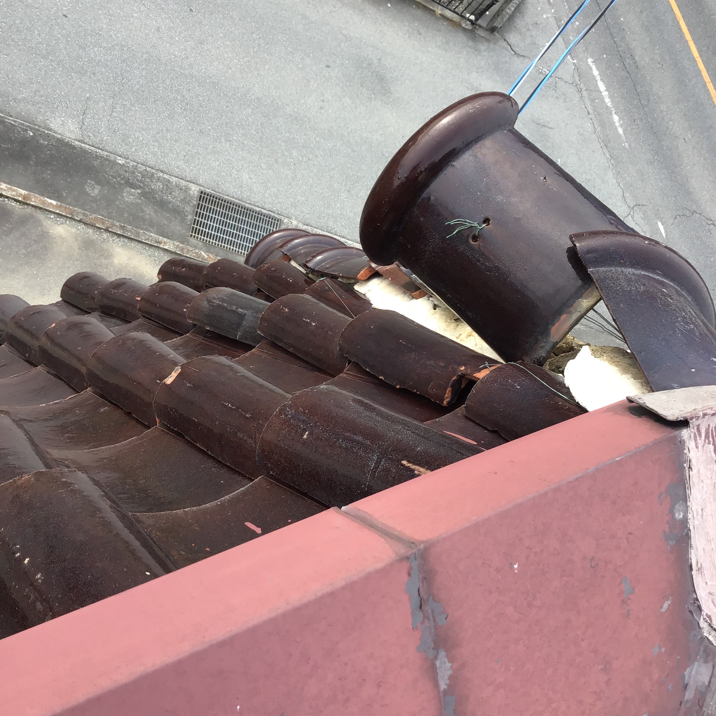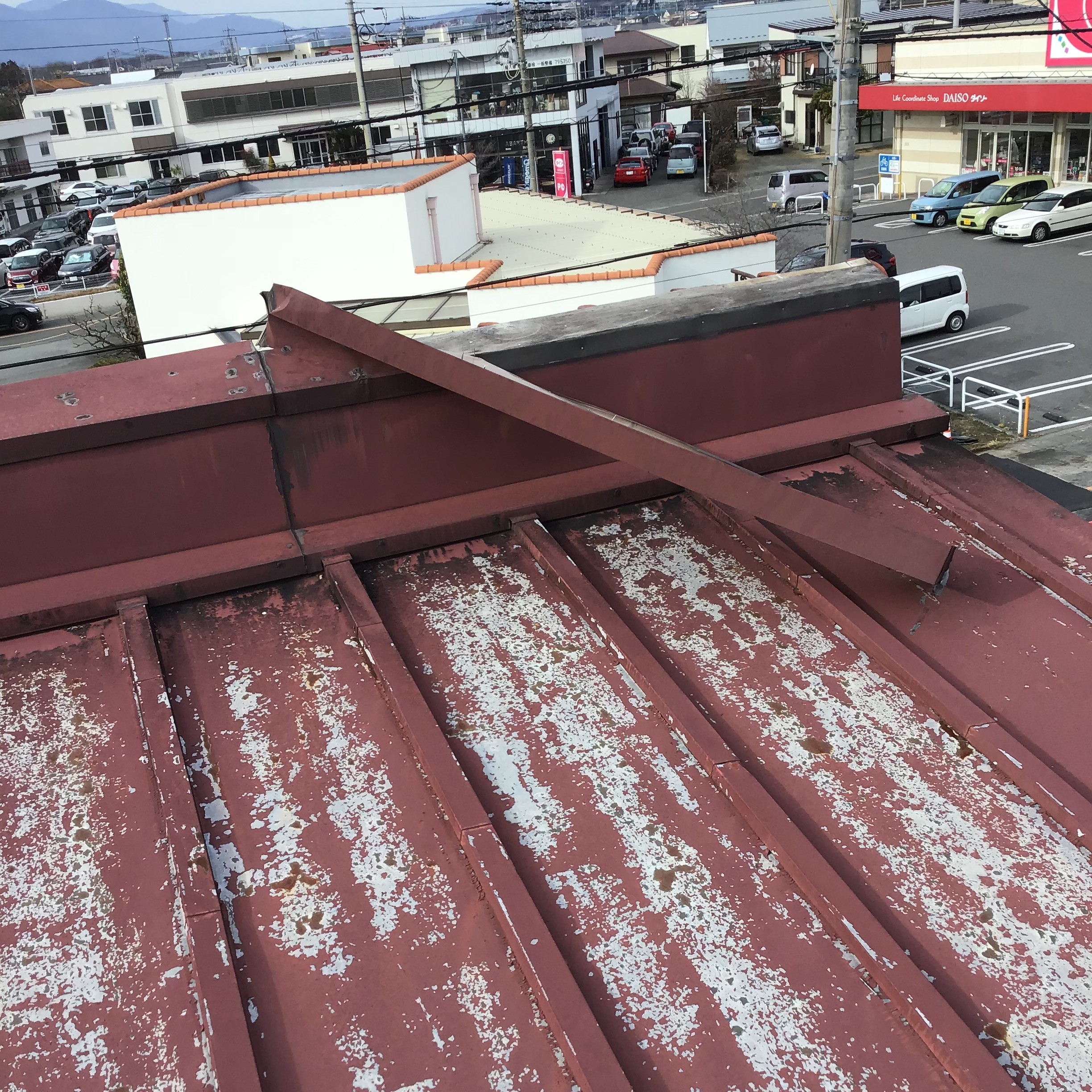 店舗の屋根の板金と瓦が強風でめくれたからと依頼を受け修理をすることになりました。