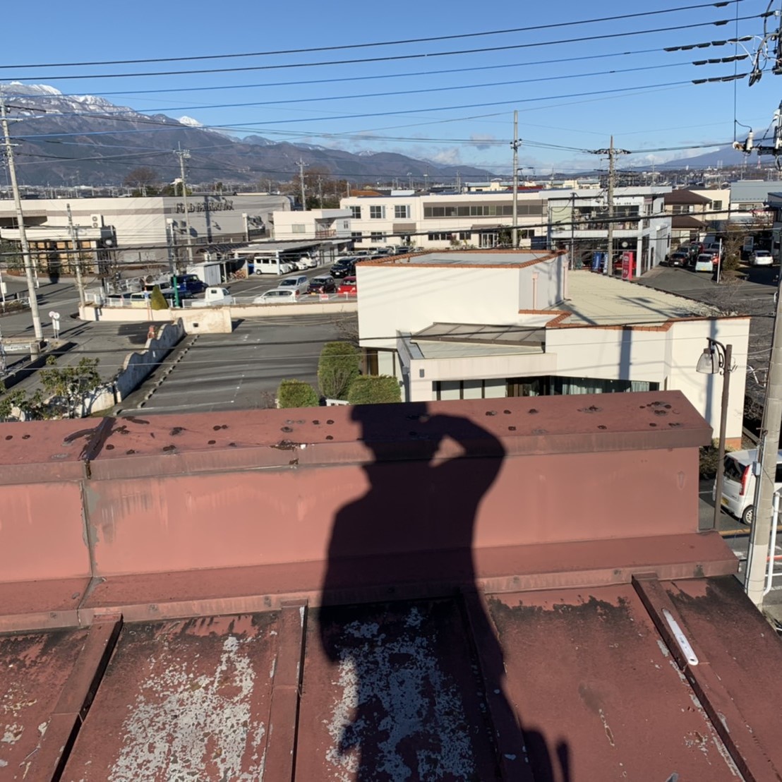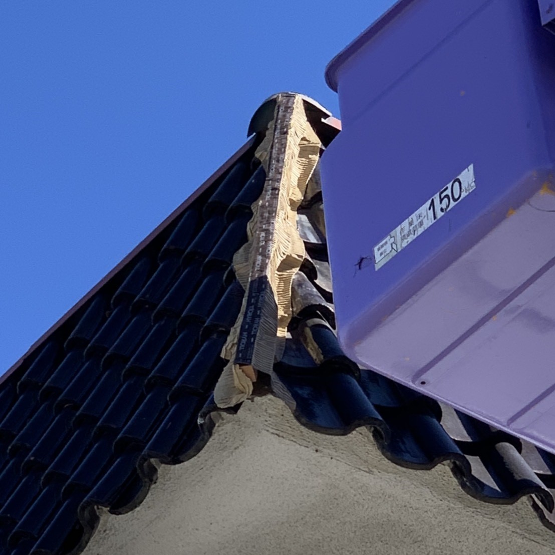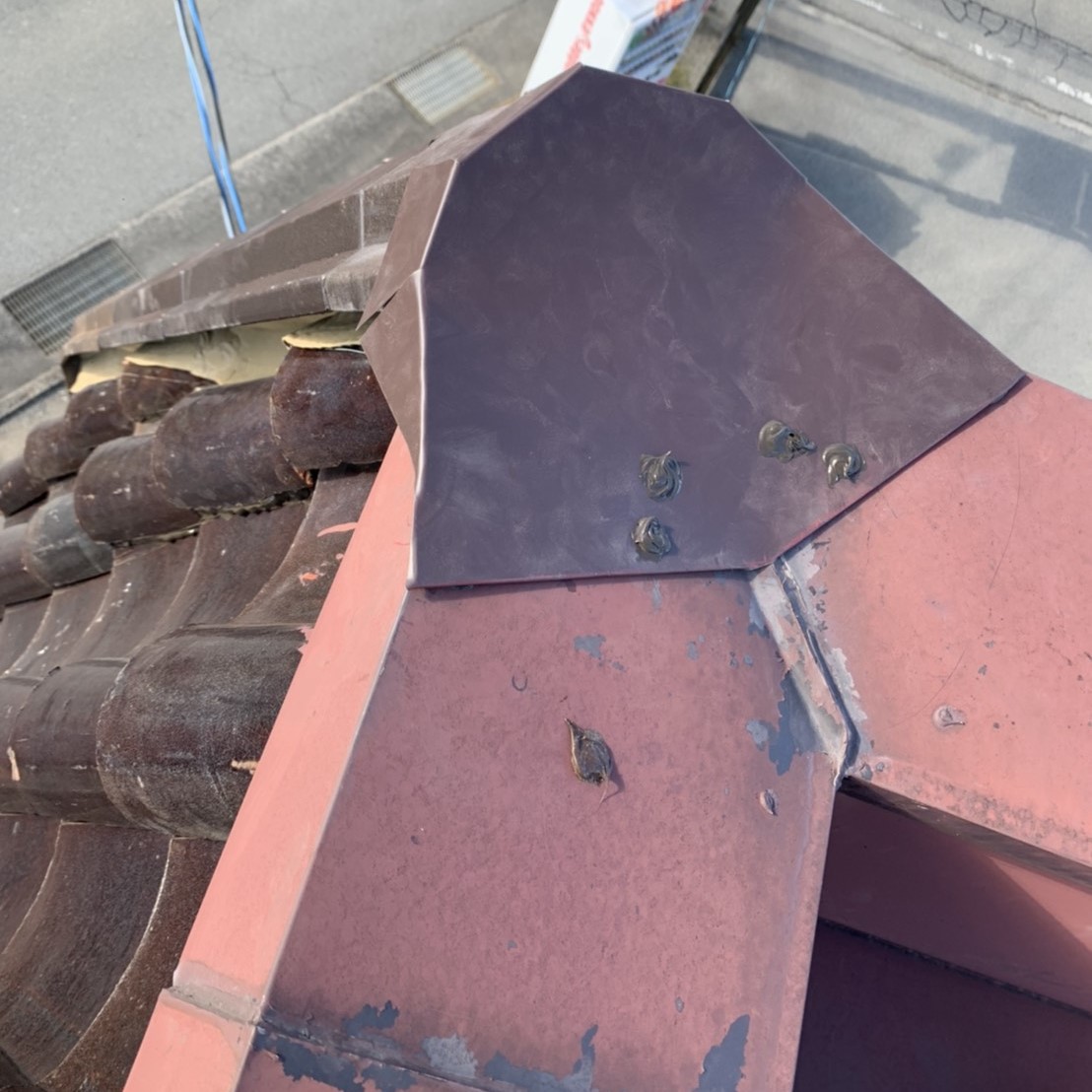 棟瓦の尻の部分に板金を加工して蓋を作りました、めくれた板金はそのまま元に戻すだけでいいということなので、戻しビスで止め直してビス頭や、既存の板金の釘の頭などにコーキングをして、今回の工事は終了です、本来ならば新しい板金などにしてあげたいところですが、予算もあまりないということなので、板金部分については応急的な修理となりました、弊社にご依頼いただきありがとうございました。